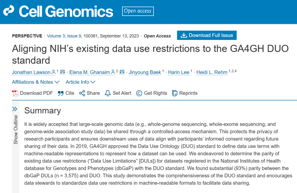The article titled “Aligning NIH’s Existing Data Use Restrictions to the GA4GH Data Use Ontology” (DOI: 10.1016/j.xgen.2023.100308) examines the compatibility between the National Institutes of Health’s (NIH) existing data use limitations (DULs) and the Global Alliance for Genomics and Health (GA4GH) Data Use Ontology (DUO). The study found that 93% of NIH datasets’ DULs could be directly mapped to DUO terms, highlighting the potential for DUO to standardize data use restrictions across genomic datasets. By adopting DUO, data stewards can facilitate more efficient data discovery and access processes, ultimately accelerating biomedical research while ensuring compliance with participant consent.