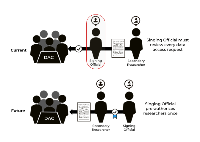 The current data access request (DAR) process for controlled-access data has significant bottlenecks. Delays are incurred by unnecessary and repetitious burdens put on Signing Officials to approve researchers for individual data requests. Delays are further exacerbated by providing data access committees (DACs) with ambiguous and non-compatible terms in dataset permissions and data access requests, which they are obligated to interpret and evaluate to maintain compliance.