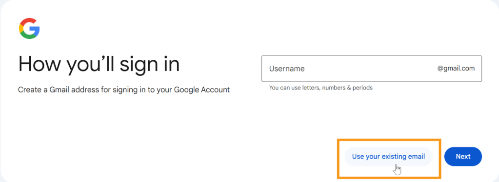 4. Follow the prompts to complete your Google account setup. Once you’ve set up the new account, you’ll be able to register on the DUOS homepage with that email address.