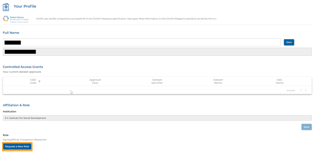 - Click on the blue “Request a New Role” button on the Your Profile page.