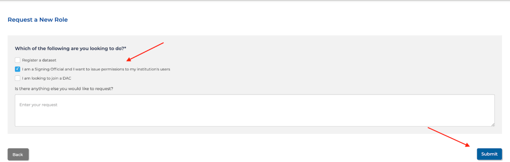 - In the menu that appears, select the box labeled “I am a Signing Official and I want to issue permissions to my institution’s users.”